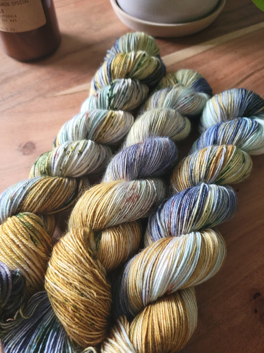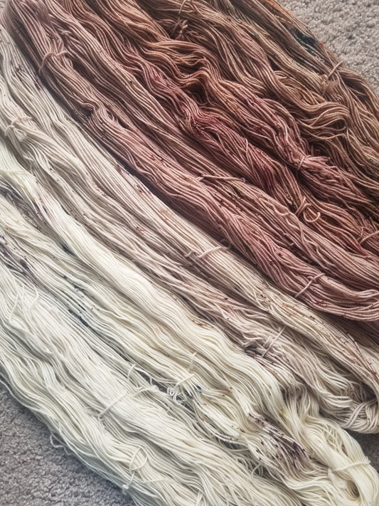 These colorways are dyed to order and may not be in stock when you place your order. Because of this, you can ensure that all of your yarn will be dyed together in the same "batch" to ensure skeins are similar to be used together. However, because these skeins are dyed specifically for you, please note that these skeins could take up to four weeks before shipping. While yarn typically gets out well before then, life happens, so if you're on a tight deadline, this may not be best choice.
