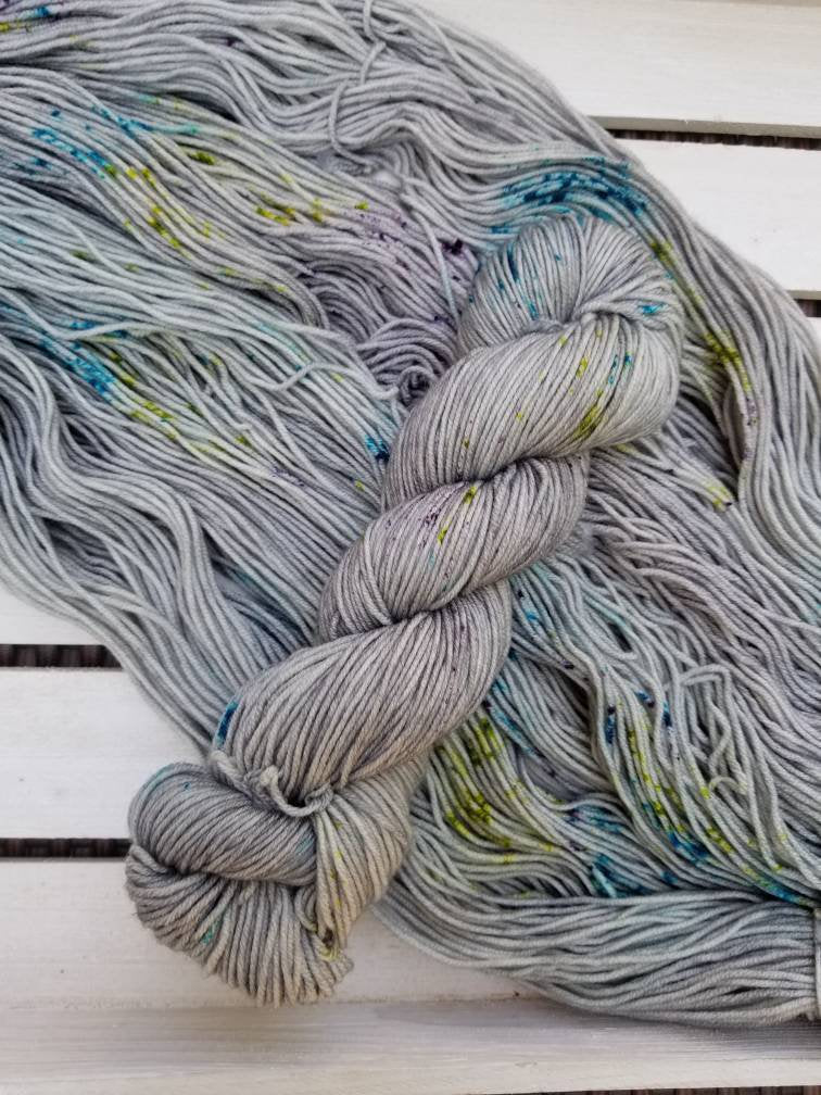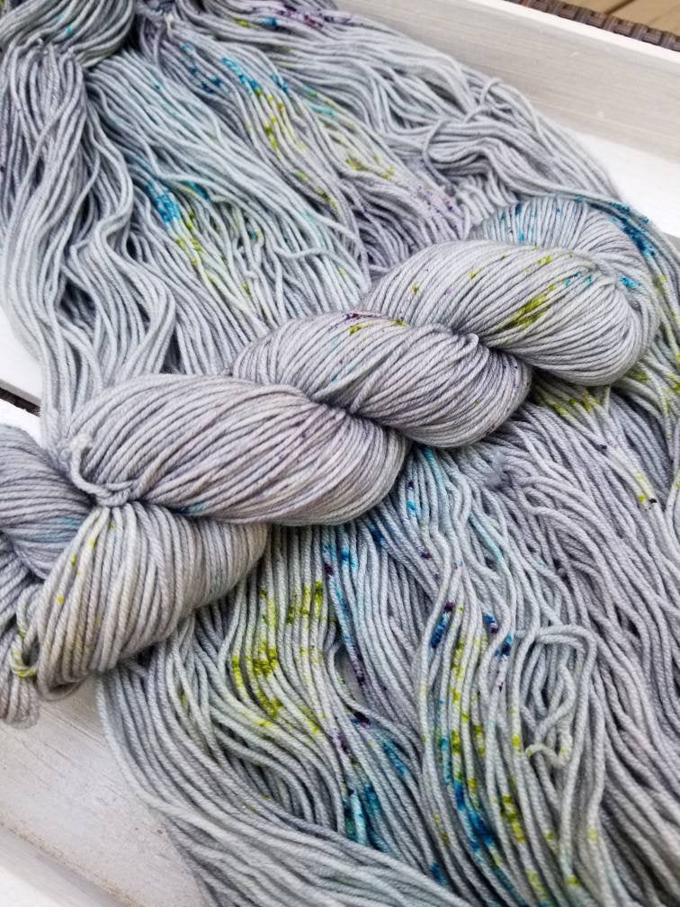 This colorway represents the love that Snape still holds for Lily, captured in the silver doe he conjures in his dying moments. A tonal silver base, with blue undertones and speckles of blue, lilac, and (of course) green speckles for Lily's eyes. Contrasts beautifully with Prickly, Night Sky, and Oogie Boogie, and fades well with Fog, Expecto Patronum, or Looking for Seaglass.