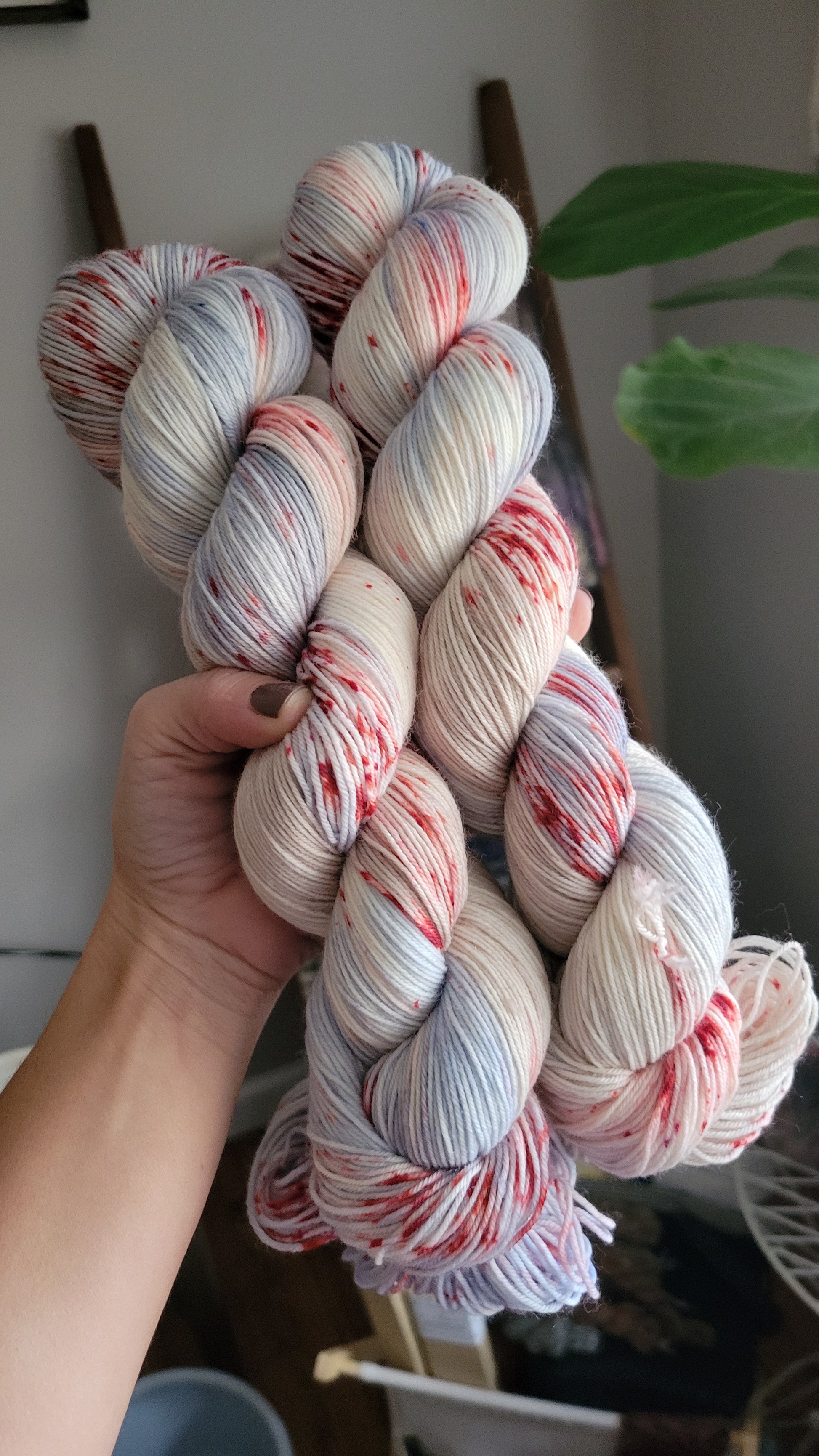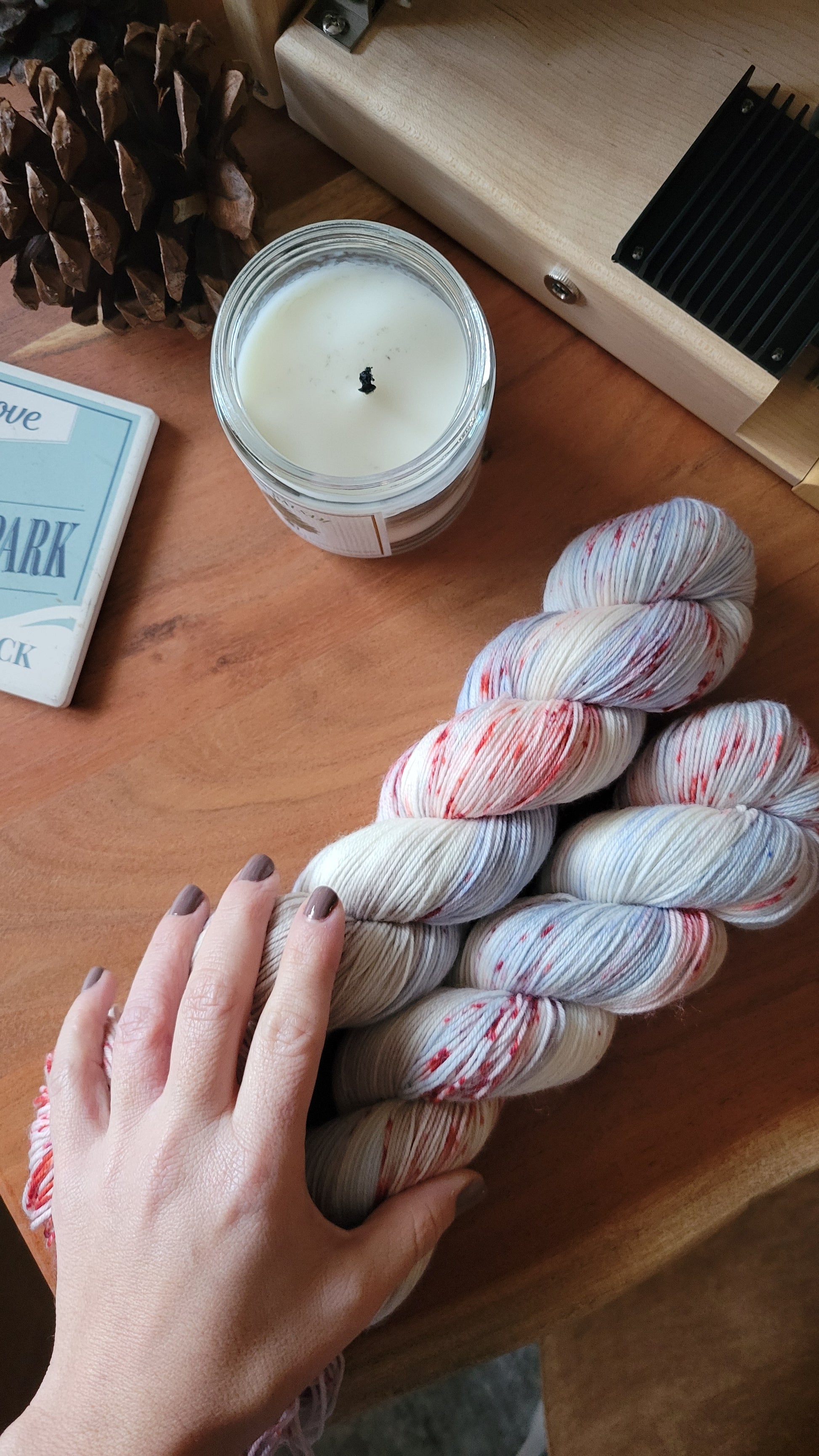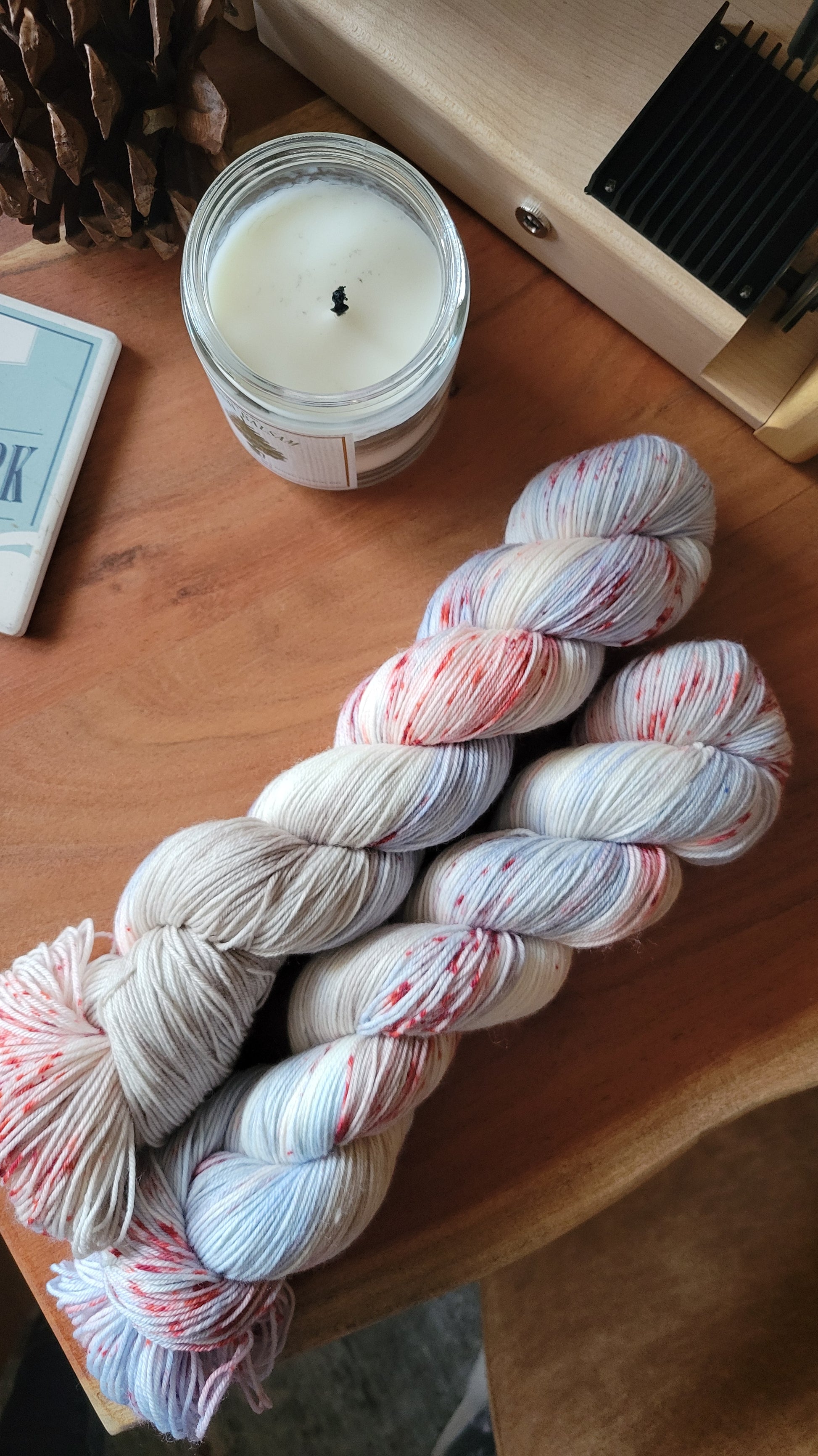 This colorway is inspired by one of the great winter moments of Gilmore Girls. This colorway will include layers of deep colors to mirror the layers of complexity as Rory learns whether she can be friends with Dean while dating Jess. A variegated colorway perfect for a winter cast on! This colorway includes the most subtle layers of sand, grey, and icy blue, with speckles of red and perfectly captures the icy cold of winter.