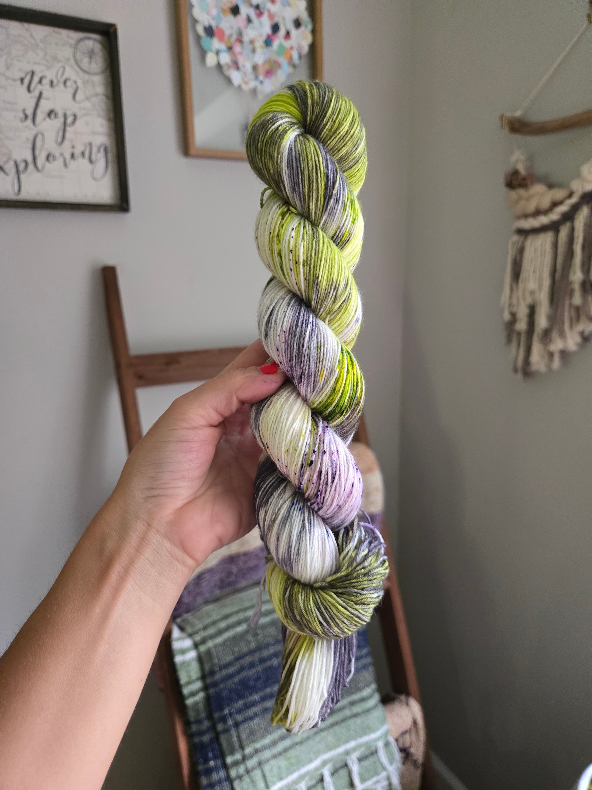This skein was the main skein for the 2024 october countdown and was inspired by the ghost with the most - Beetlejuice himself. This variegated skein includes layers of dark Grey and chartreuse with pops of green and purple to perfectly capture the grungy goodness of our favorite demon.