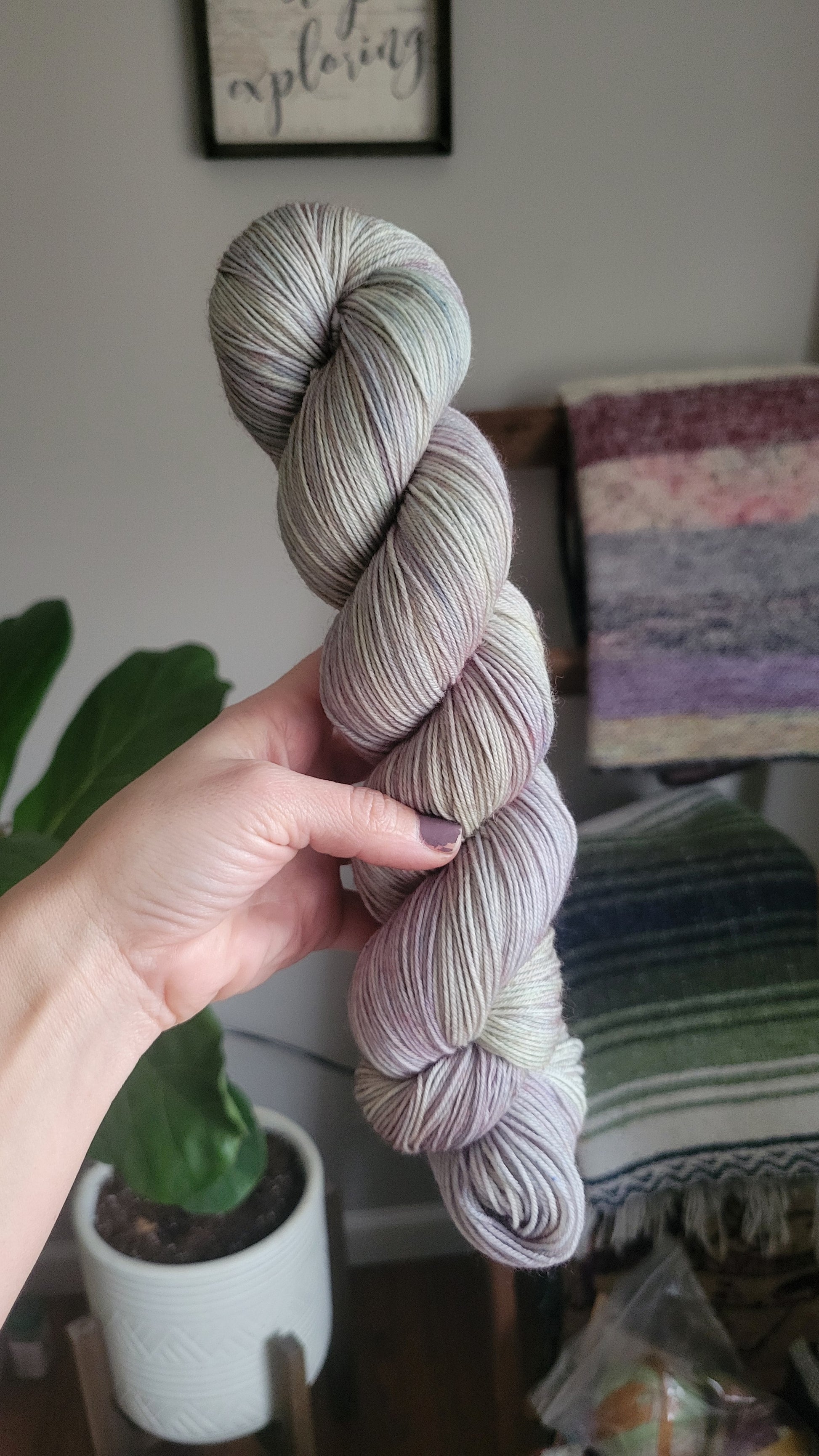 This tonal colorway includes layers of various greens and greys to create an almost iridescent colorway that can chameleon to go with any color you hold it with.