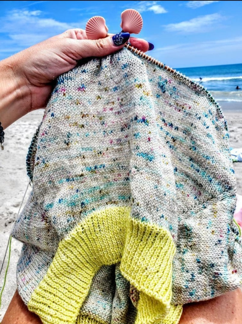 Size 7-9 includes three skeins of the Main Color, and one skein of the Contrasting Color on my Sunfish base. This includes 1389yd/300g of MC, and 463yd/100g CC.