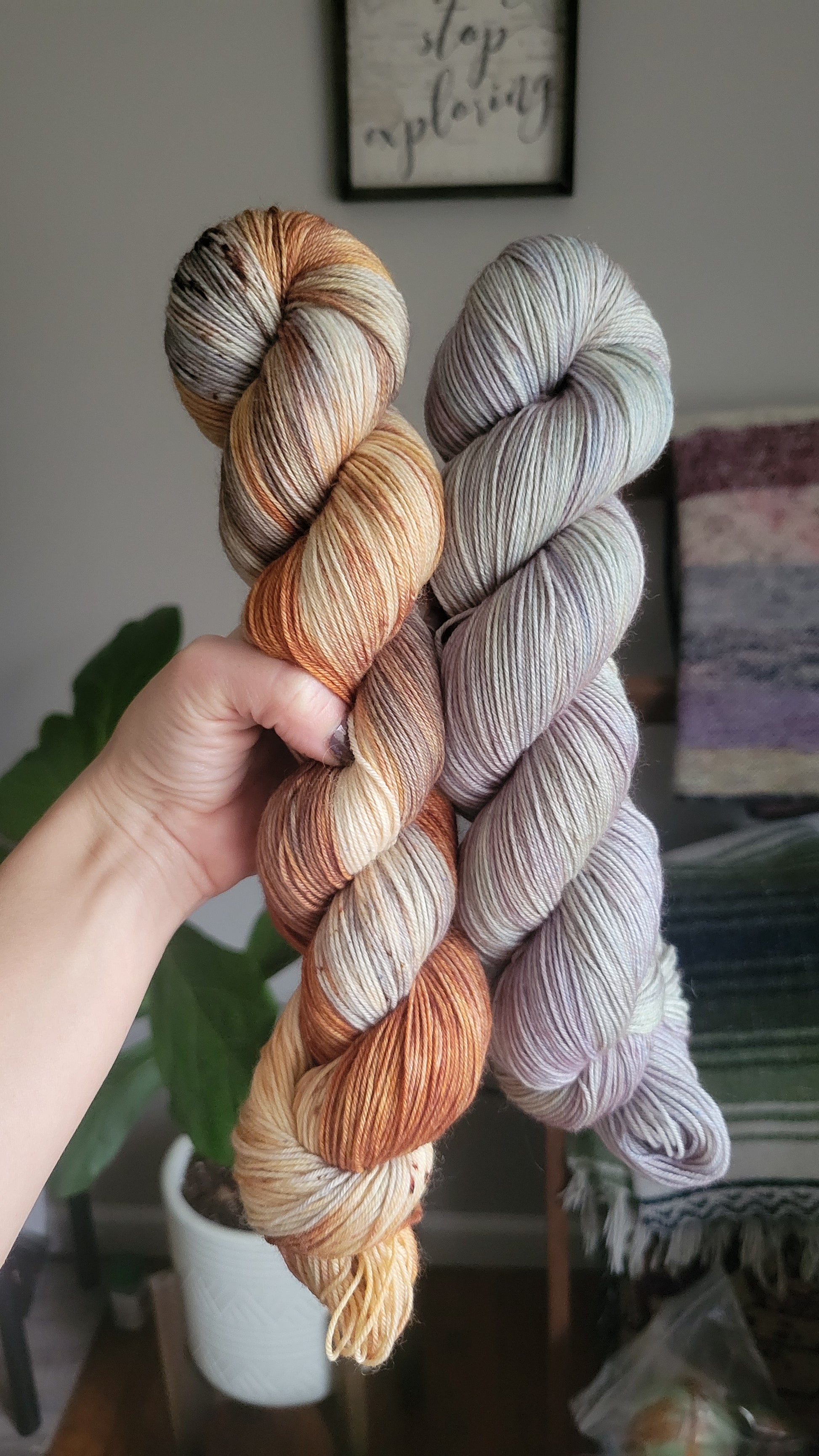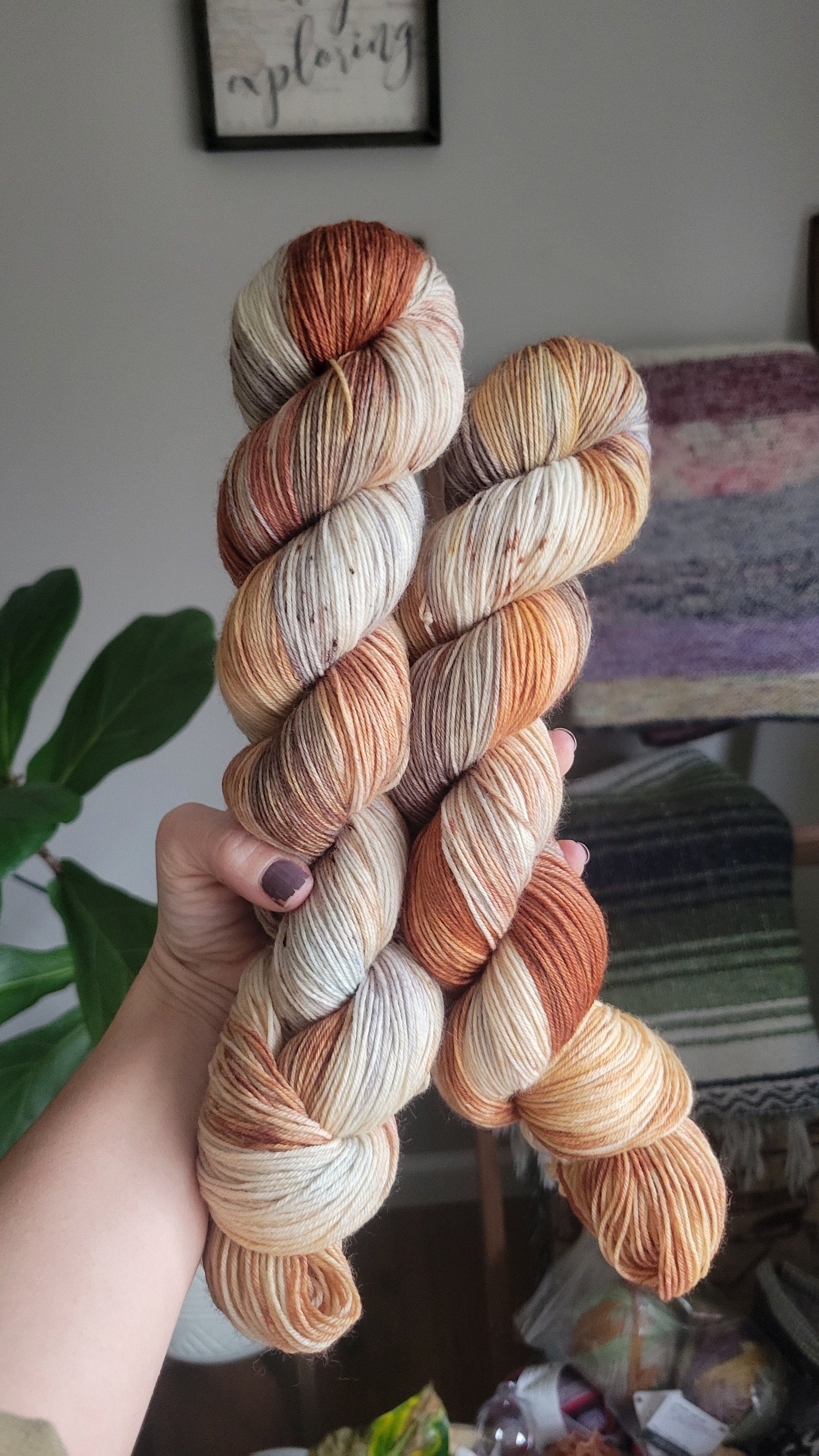 This variegated colorway includes layers of tans, caramel, browns, robins egg blue, and grey greens with copper speckles.