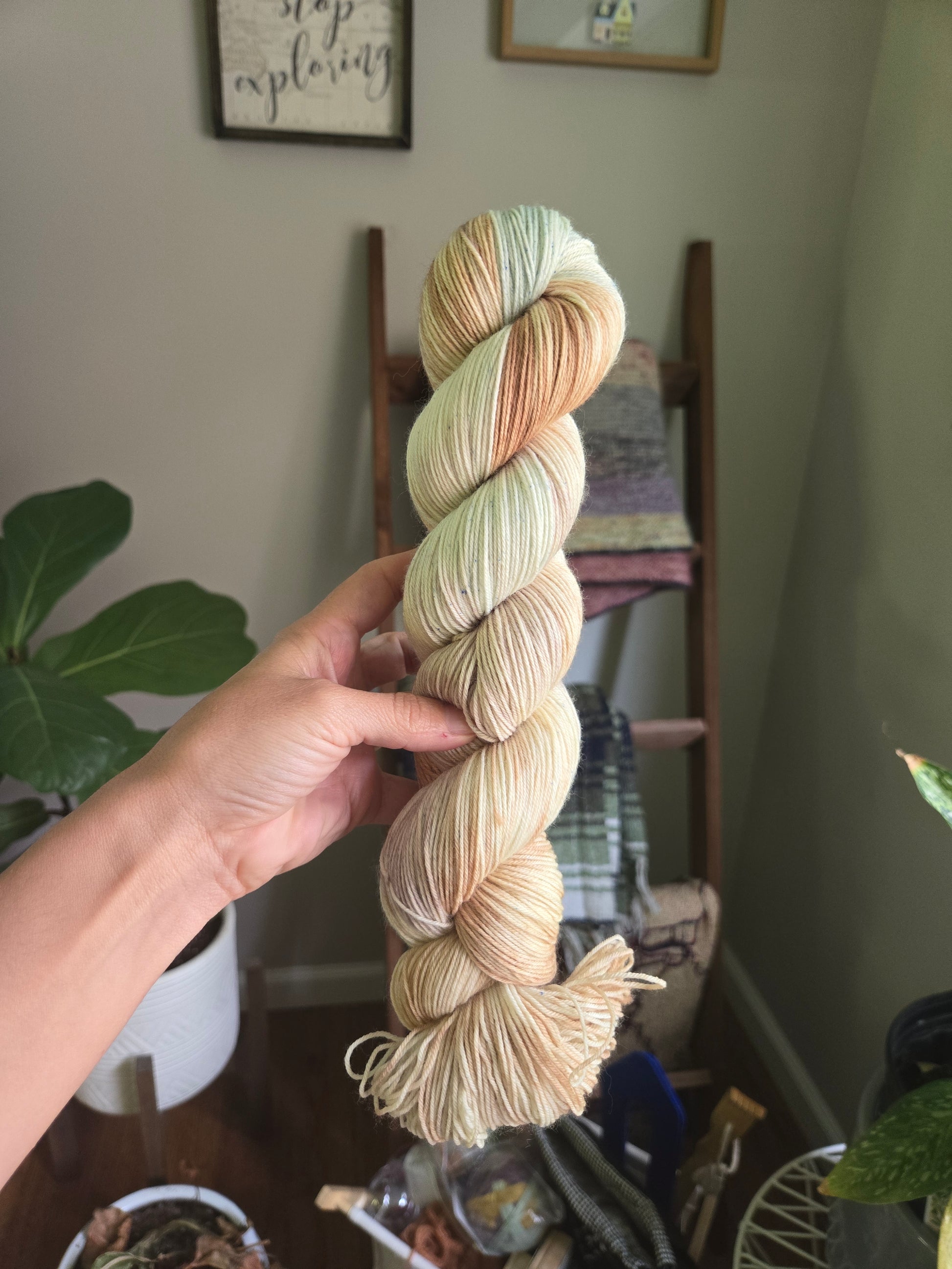 This variegated colorway includes layers of blues, tans, browns, and robins egg blue. As the only variegated colorway in this collection without a speckle, it creates a soft, watercolor palette that pairs well with so many colorways.
