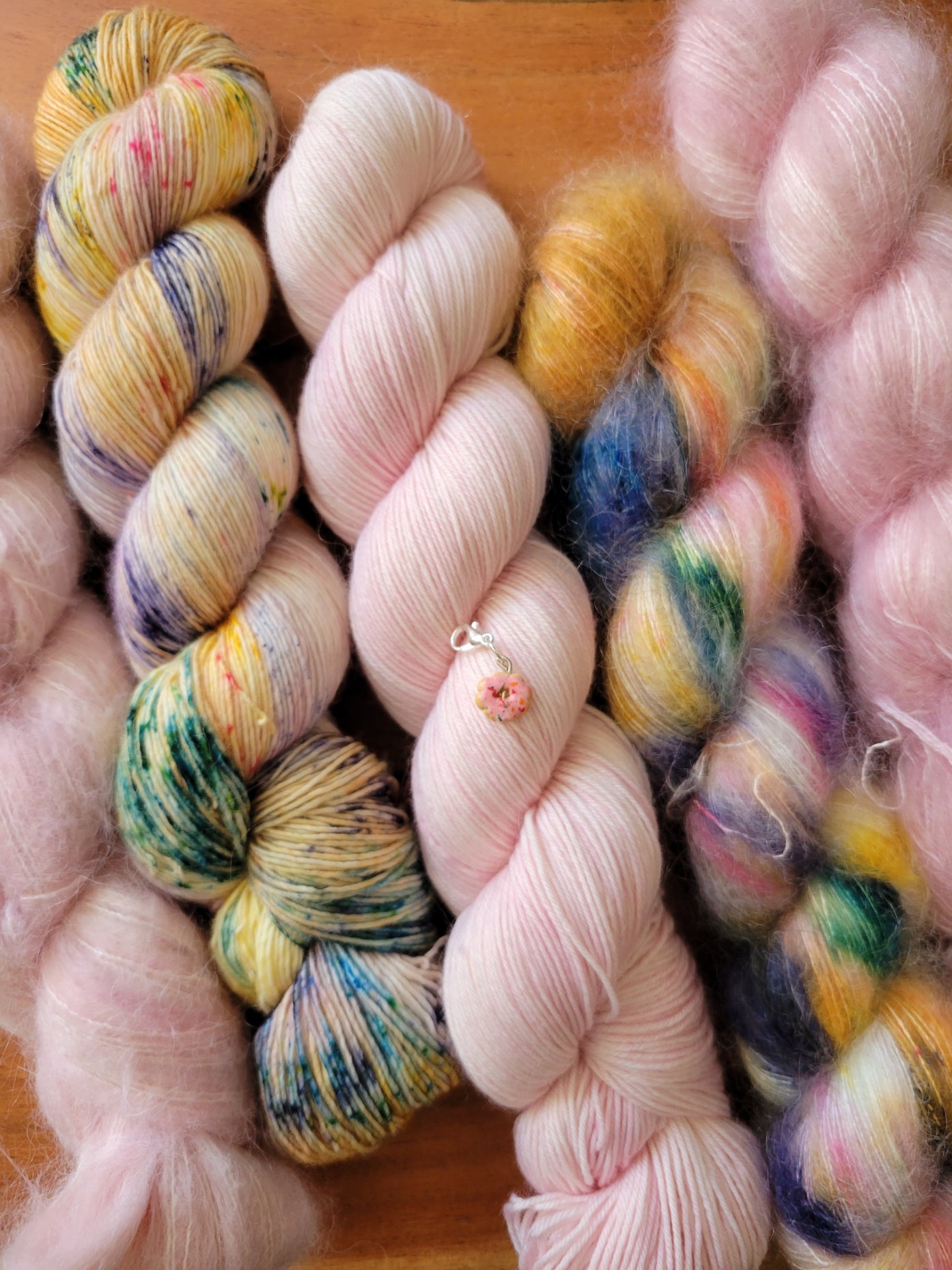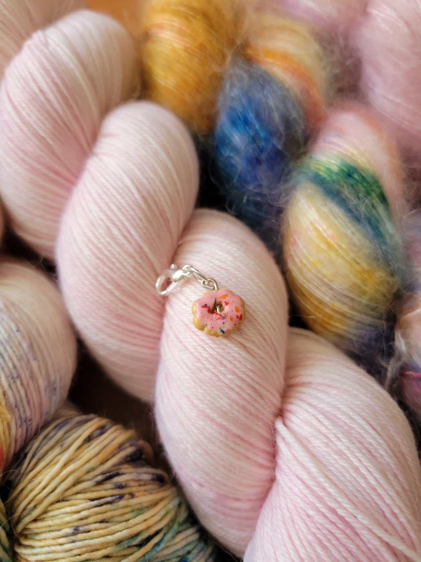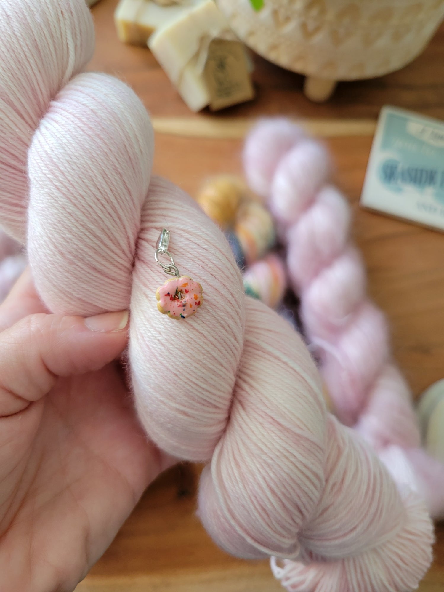 This unique, hand-crafted charm is a part of the Box of Donut Collection that's a playful take on a strawberry frosted donut, with rainbow sprinkles. These charms are a pre-order and will be shipped over the next weeks along with your yarn or when available.