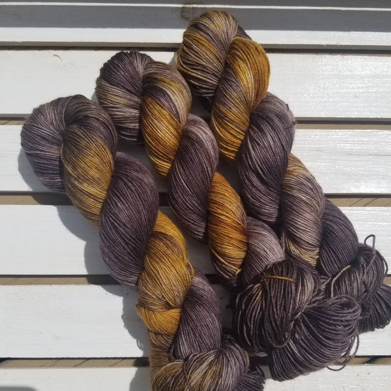 This variegated colorway was dyed to represent the second gift of death - the resurrection stone. This colorway includes layers of brown, black, and a golden yellow, in full representation of the stone itself and Marvolo Gaunt's ring.