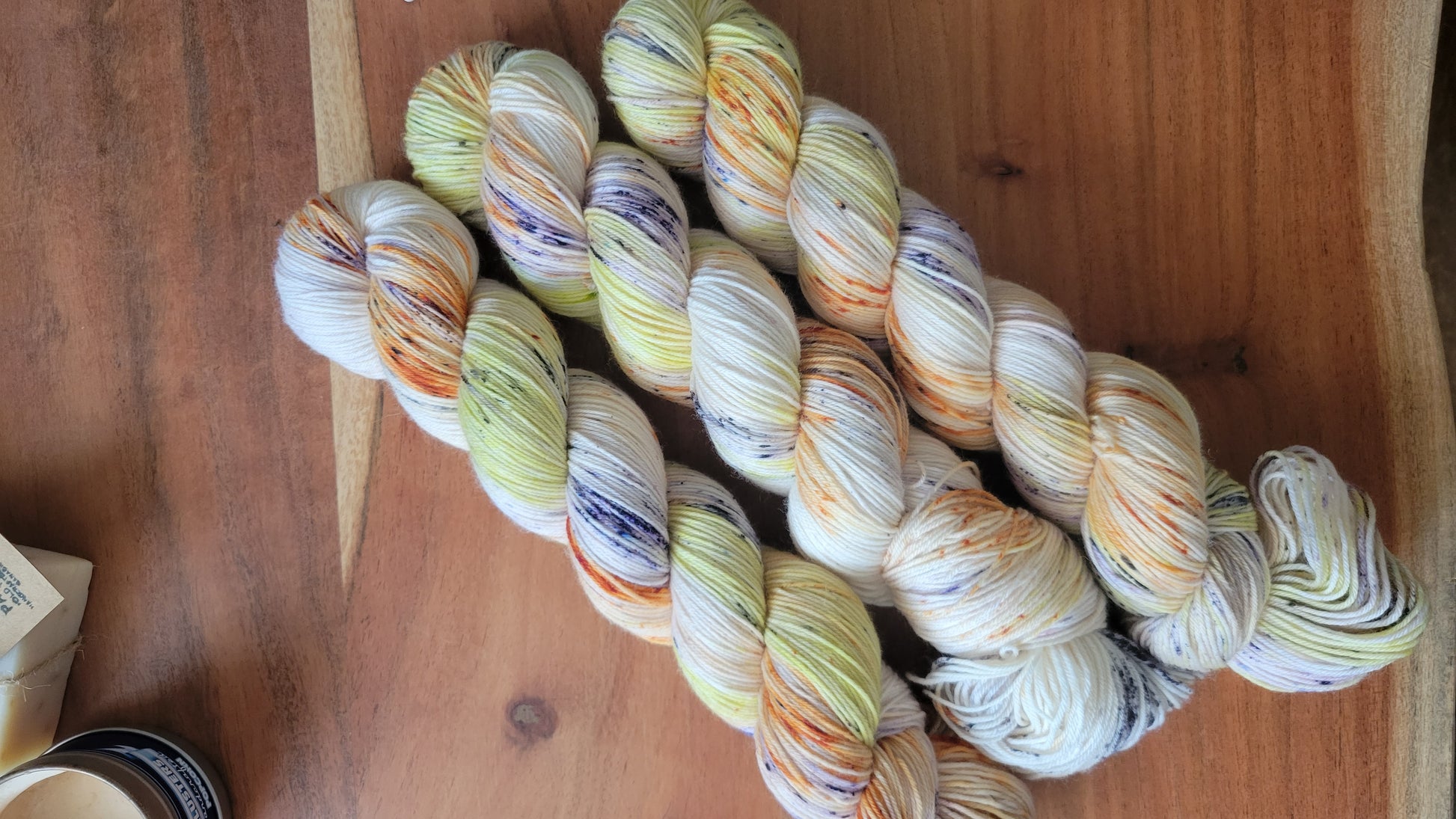 This variegated colorway includes splotches of chartreuse with speckles of deep purple, pumpkin, and black - all the pieces of a perfect Halloween colorway. This colorway would pair perfectly with Oogie Boogie, Troll Boogies, Eggplant, Sea You at Dusk, Sirius Black, and Rusted Spokes (basically anything spooky) and would be the perfect colorway to hold with another strand of yarn - either as mohair with another tonal or with a tonal mohair. Spooky Everyday Slouchie Beanie anyone? This color is shown on my sunfish, 420, and cloud base.