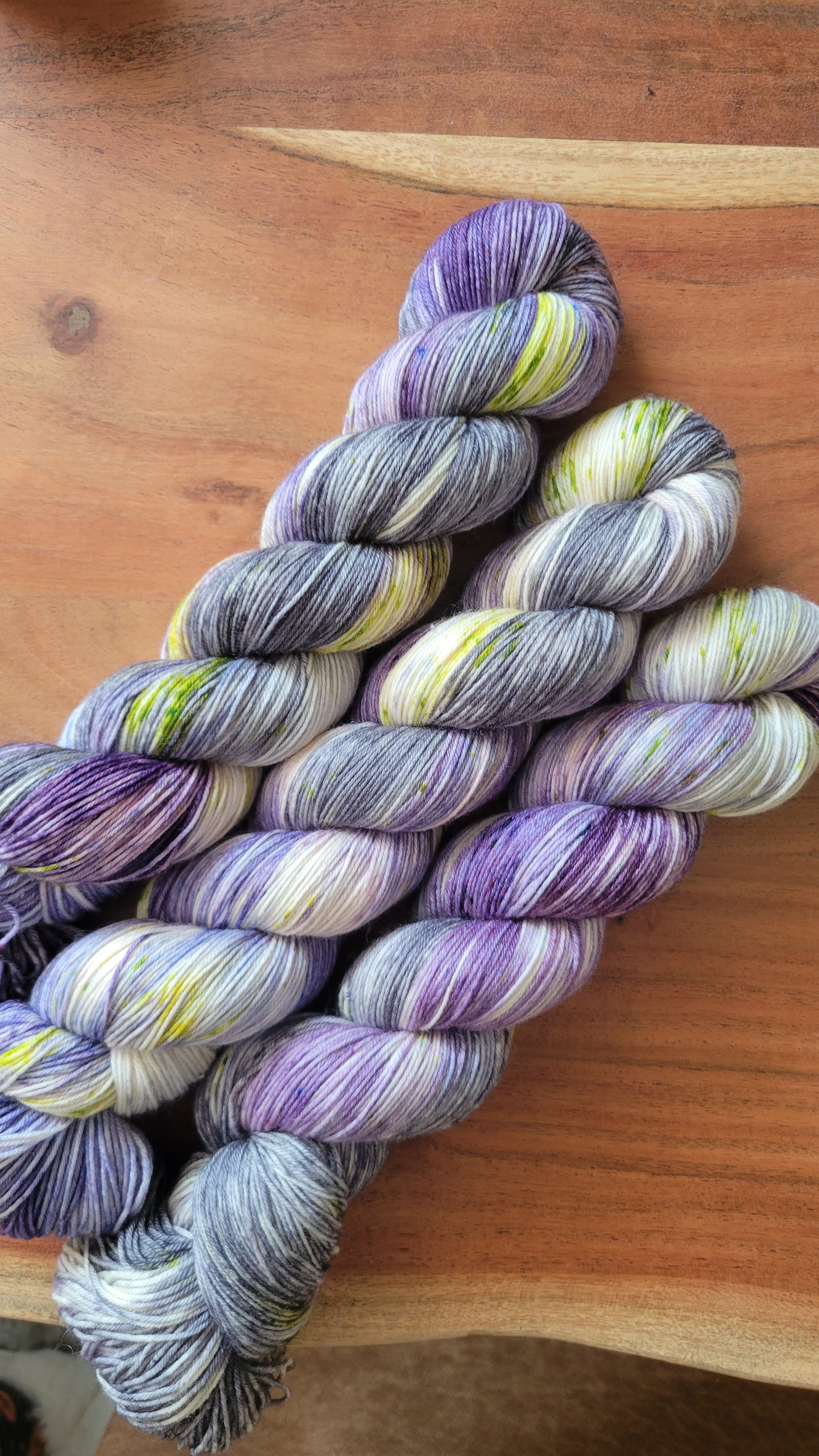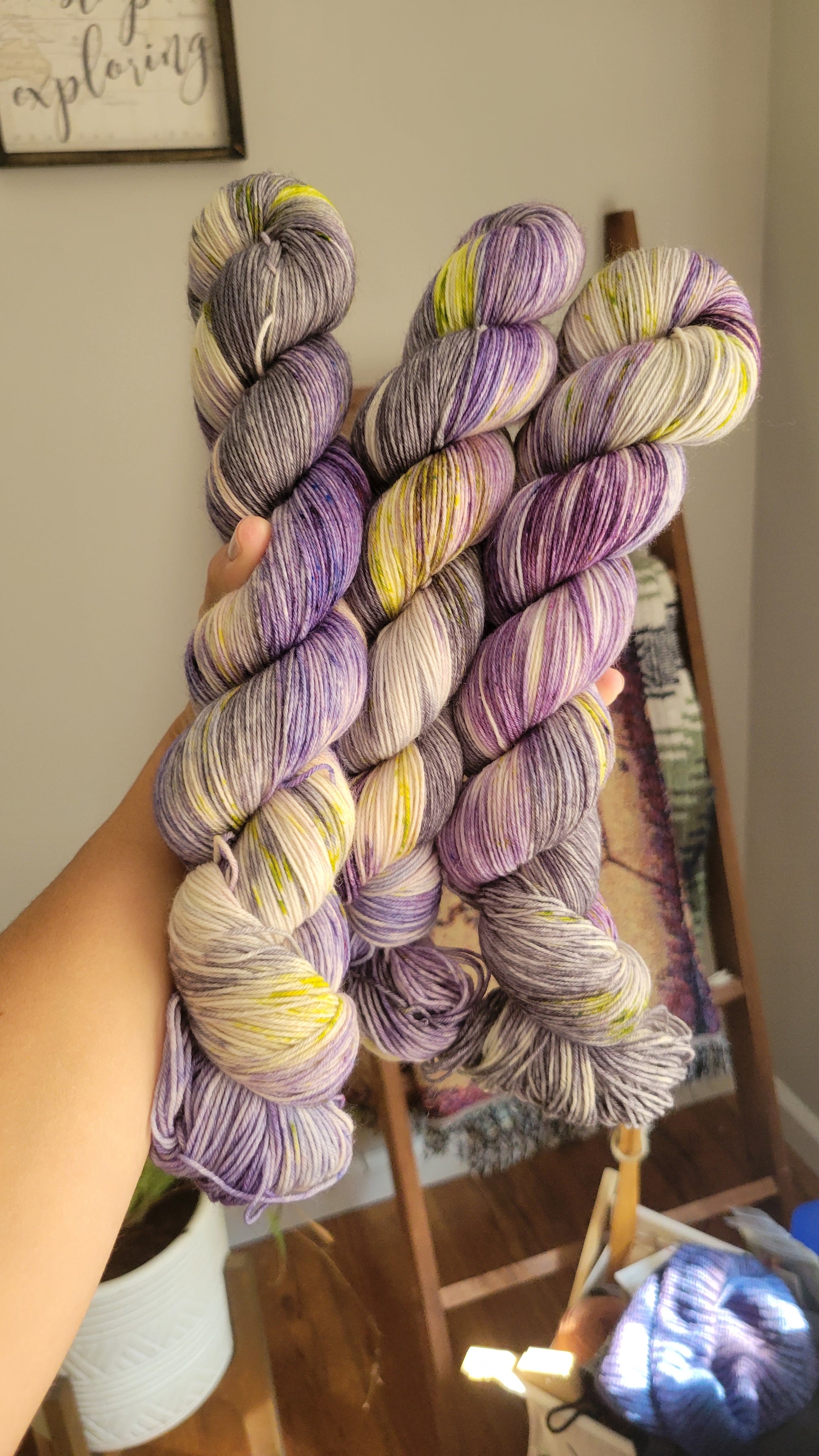 When I was young, my sister and I would beg to go to my Aunt's house for sleepovers. Why? Because she let us create these "concoctions" where we could mix anything in her kitchen into a bowl and see what happened. When I think of halloween, these concoctions, and this colorway is exactly what I think of. Deep purple, variegated (and overdyed) with Black, with chartreuse speckles adding pops of color throughout. Perfect for any halloweeny creation (or year round if you enjoy moody colors like I do). Pairs with Oogie Boogie amazingly. This color is shown on my sunfish base with Oogie Boogie.